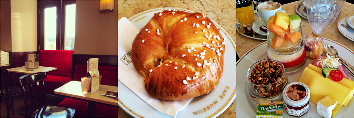 The Cafè Museum in the city center is such a place. Traditional interior with red upholstery on benches, black wooden chairs reminding of Thonet and marble coffee tables. High ceiling and big windows allow for a bright and very cosy ambiance. Right when entering the place a big display full of mouthwatering cakes and cookies of all sorts and sizes set the tone for the visit. The menu reveals even more delicacies – coffee needs company too! I do enjoy having breakfast at Viennese coffee houses. A classic Viennese breakfast, “Wiener Fruehstueck”, consisting of a cup of coffee, freshly baked rolls, butter and apricot jam, I could have every day. A decent and recommended addition is a soft boiled egg. For extended breakfast some juicy ham and cheese shall be added and a pice of pastry not to be missed. The center picture above shows a “Butterkipferl” which is a kind of a brioche-croissant – super delicious!