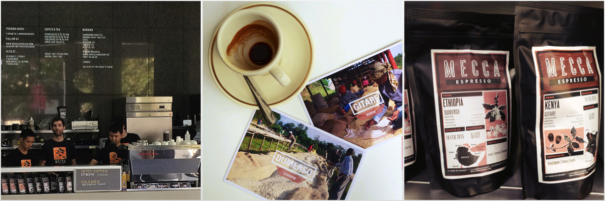 One of the guys explains to me that the coffee supply and bean selection is very seasonal for Mecca Espresso, as the harvesting seasons differ around the globe. Therefore, when looking at which coffee they are promoting and also the retail bags of freshly roasted coffee on the shelf, the beans currently come from Kenya and Ethiopia as this is the time of the year for Africa to supply their produce. More precisely their Ethiopian coffee comes from the Yirgacheffe region in the south, where 246 small bean farmers contribute to the Dumerso cooperative. The Kenyan coffee on offer originates from the Gatundu region, where 620 members participate in the Gitare cooperative. I’d like to suggest this read on “terroir” and its impact on coffee flavour in general and the characteristic of the Yirgacheffe region in particular: COFFEES AROUND THE WORLD. Self-evident I had to try an espresso of one of the two, and as Gitare was filled in the grinder, that was the one: fruity, acidy and even a bit lemony I would say… definitely a pleasant espresso! I am glad to see yet another case that fairly and ethically traded coffee benefits everyone in the value chain, in this case from the farmer in Africa to the consumer in Sydney.