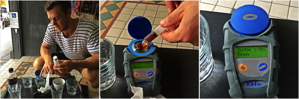 My recent visit to Greenhouse Coffee in Sydney (read more about the visit here) revealed something I wasn’t aware of: even Baristas today got hooked on technology, and here I am not talking about their fancy espresso machines! While discussing with Marcus, the owner of Greenhouse Coffee, about the beans he is using and how he utilises his La Marzocco for preparing great espressos, he all of a sudden got up to get a gadget from the coffee bar. A hand sized, dark grey device with a blue circle and a small display on it, looking very engineery. As he explains this was a coffee refractometer which measures the Total-Disolved-Solids (TDS) in coffee, both filter coffee or espresso. This is done by putting a drop of the actual coffee liquid, onto the device’s lens underneath the blue circular cap, hitting there GO button and letting it do its analysing magic. Moments later a single percentage value appears on the small monochrome display. This value he then punches into the iPhone app “VST CoffeeTools”, along with the amount of water and ground coffee he used to make the espresso. And voila, the device helps to optimise those ratios for future brews, which is to be customised for every bag of beans he receives. Astonishing! Why is that important? Because the coffee-water-ratio as well as the extraction time are crucial to get the right amount of solids out of the beans into the cup. This determines if your coffee tastes flat, sour or bitter.