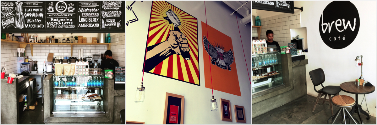 It’s located on Jumeirah Beach Road, close to Jumeirah Beach hotel, right opposite of Emarat gas station. Brew Café is a small coffee bar of modern industrial interior design with blank concrete floor and counter, elements of steel and untreated wood beams along the walls serving as tabletops. The place is brightly lid through the floor to ceiling window front.