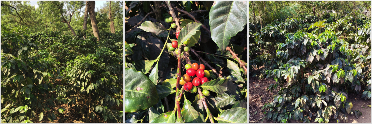Finca Colombia grows Arabica coffee of two kinds, Burbon and Caturra. The plants can be distinguished by height and vertical distance of branches. Burbon plants grow taller (approx. 2m+) and their branches are further apart. Arabica Caturra plants grow short and bushy instead.